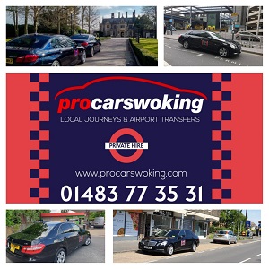 Pro Cars Woking is a trusted Woking taxi company, offering 24/7 local taxi services and airport transfers to Heathrow, Gatwick, Luton, Stansted, London, and beyond. We track your flight, provide professional meet-and-greet service, and ensure every journey is smooth and comfortable in our clean, modern vehicles. A 3-time award-winning company with excellent 5-star reviews.